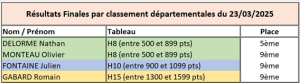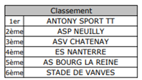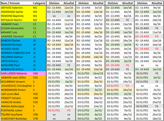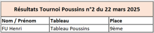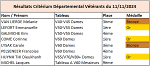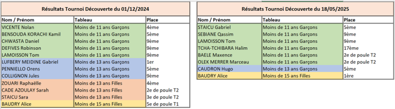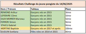 Epreuves diverses RESULTATS SAISON 2024 / 2025 Critérium fédéral individuel Critérium individuel vétérans départemental Critérium individuel vétérans régional Critérium individuel vétérans France Finale par classement Tournoi poussins Tournoi découverte Challenge du jeune pongiste Génération club